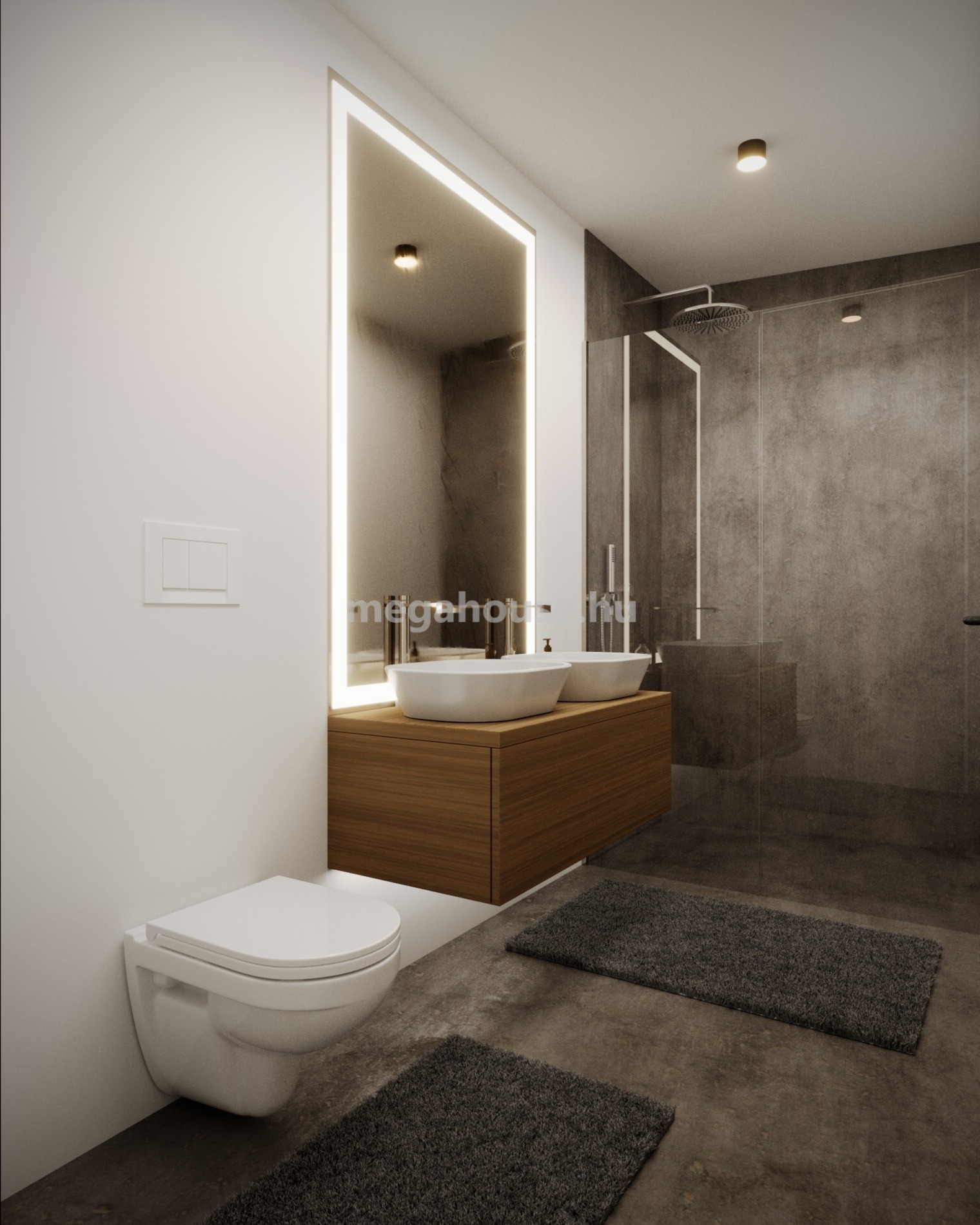 FÖLDSZINT ( 108 nm ) : Tágas amerikai konyhás nappali–étkezővel, külön mosdóval, valamint a gardróbot és külön mellékhelyiséget magába foglaló hálószoba ( 22 nm ) kialakítással.
