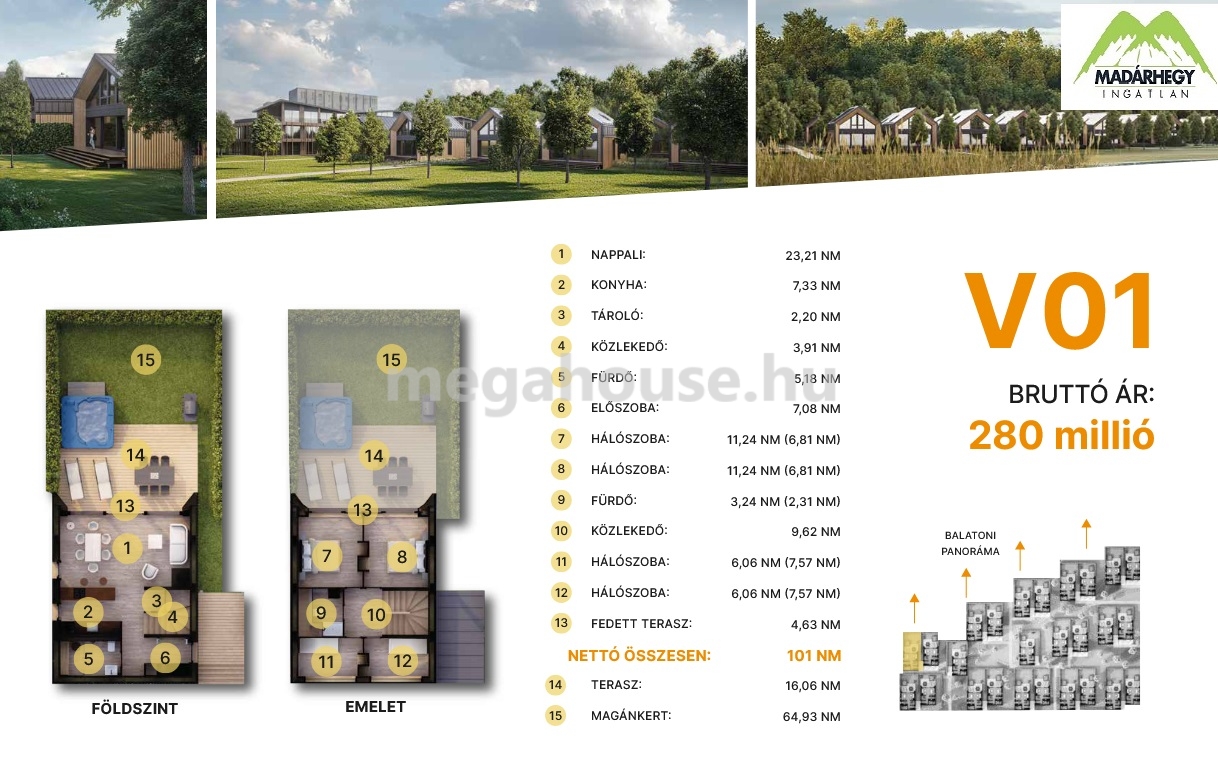 101 nm-es, N+4 hálós ikerház, 16 nm terasszal és 65 nm saját kerttel 280 M Ft-ért eladó.