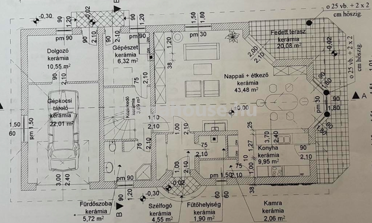 Az épület alsó szintjén található a rendkívül tágas, amerikai konyhás/étkezős nappali, melyhez kapcsolódik egy részben fedett, 20 nm-es terasz. A ház konyhája gépesített, kamrahelyiséggel kiegészült.