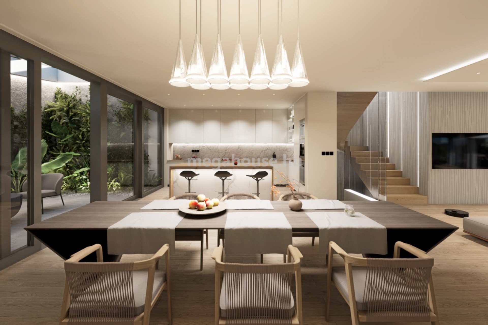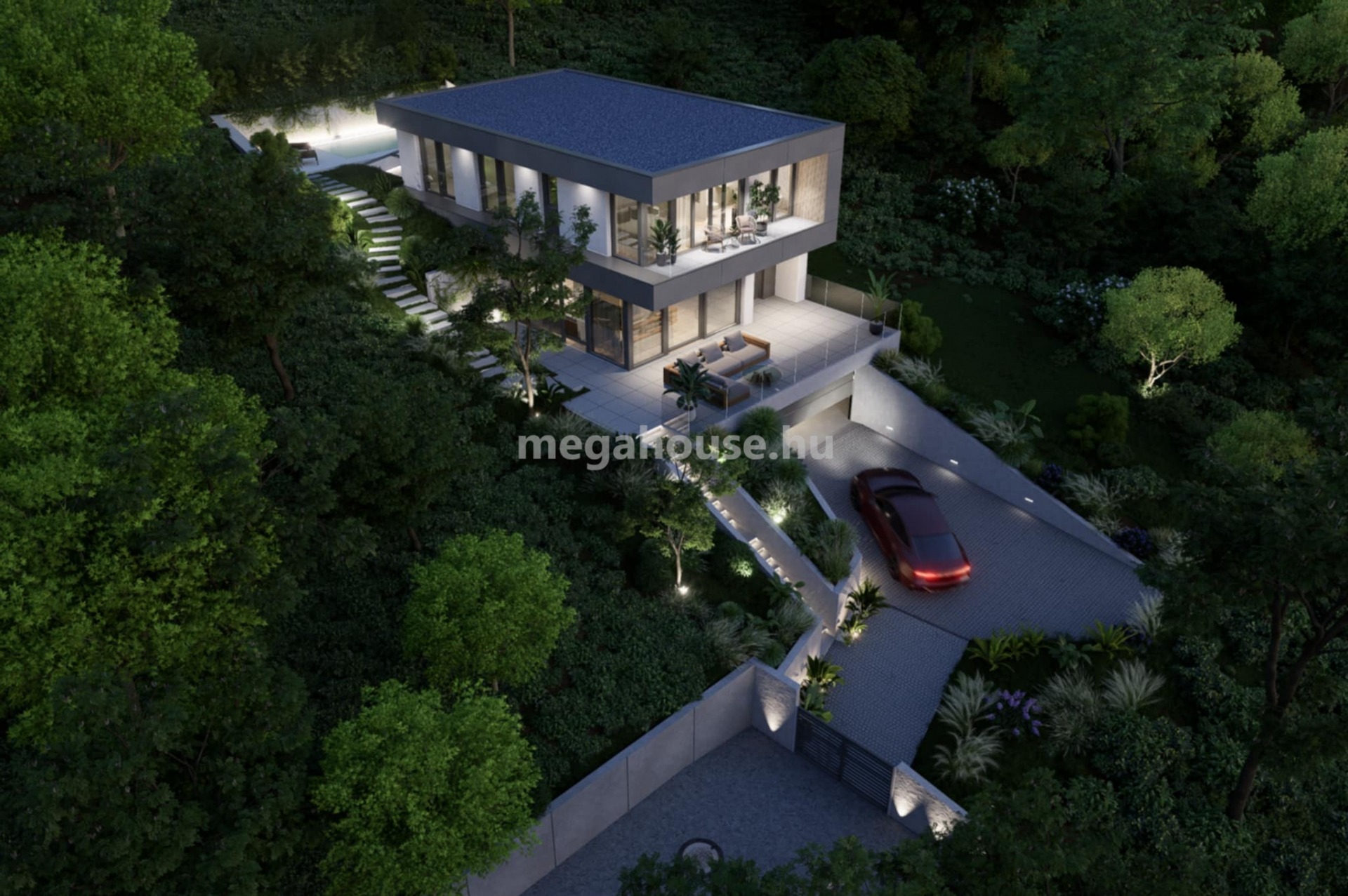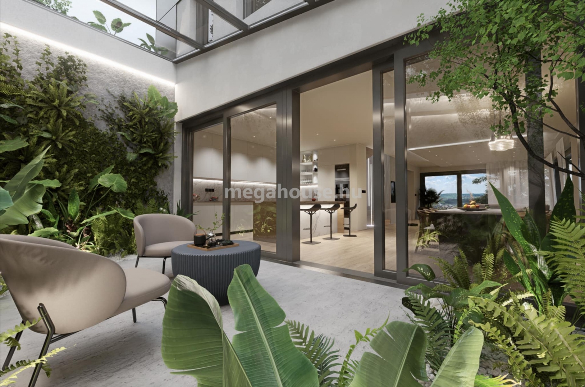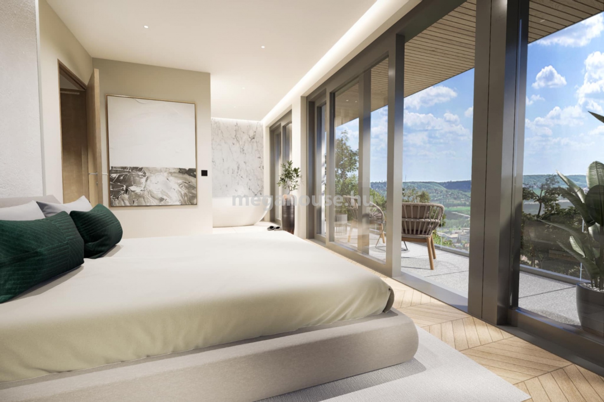 Az ingatlan 4 HÁLÓSZOBÁVAL rendelkezik, köztük egy elkülönített szülői master bedroomnal, saját kádas fürdőszobával és gardróbbal. A házban összesen 3 fürdőszoba található. A közel 70 m²-es amerikai konyhás nappali tágas, világos életteret biztosít. Innen közvetlen kapcsolat nyílik a 21 m²-es fedett JAPÁN KERTHEZ és a 46 m²-es PANORÁMÁS teraszhoz.