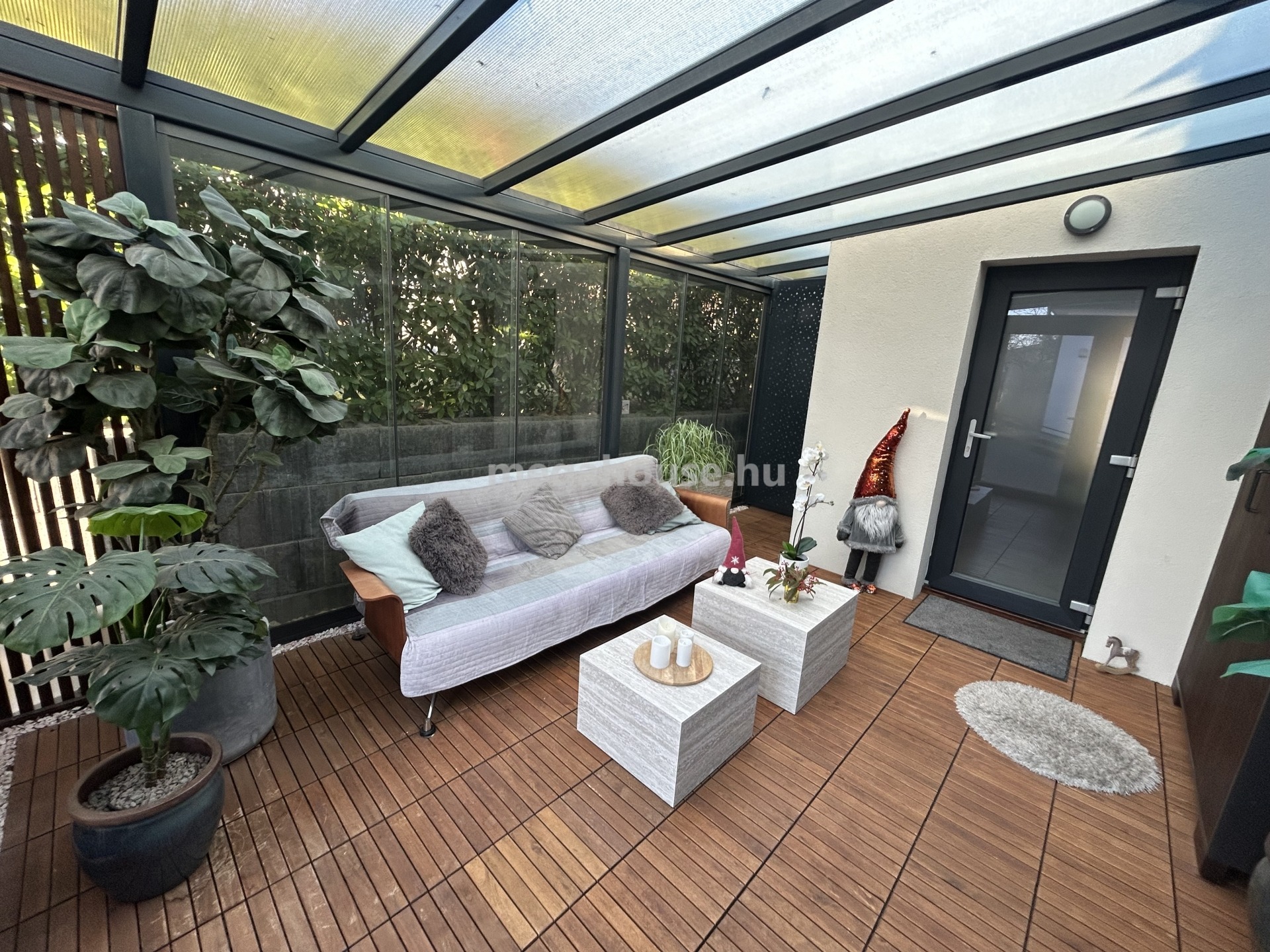 Innen nyílik egy 27 nm-es, jól hasznosítható terasz, azon túl pedig a szépen gondozott, robotfűnyíróval és 7x3 méteres medencével rendelkező kert, mely a telek adottságainak köszönhetően teljesen intim.