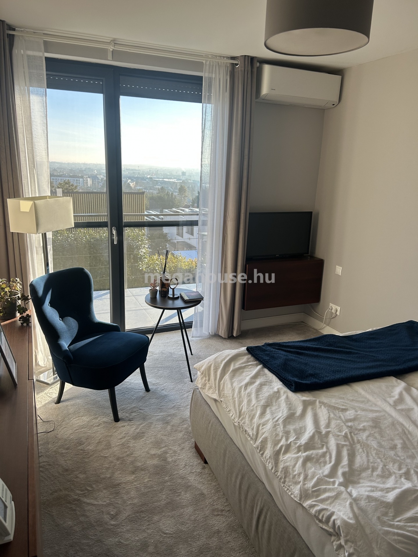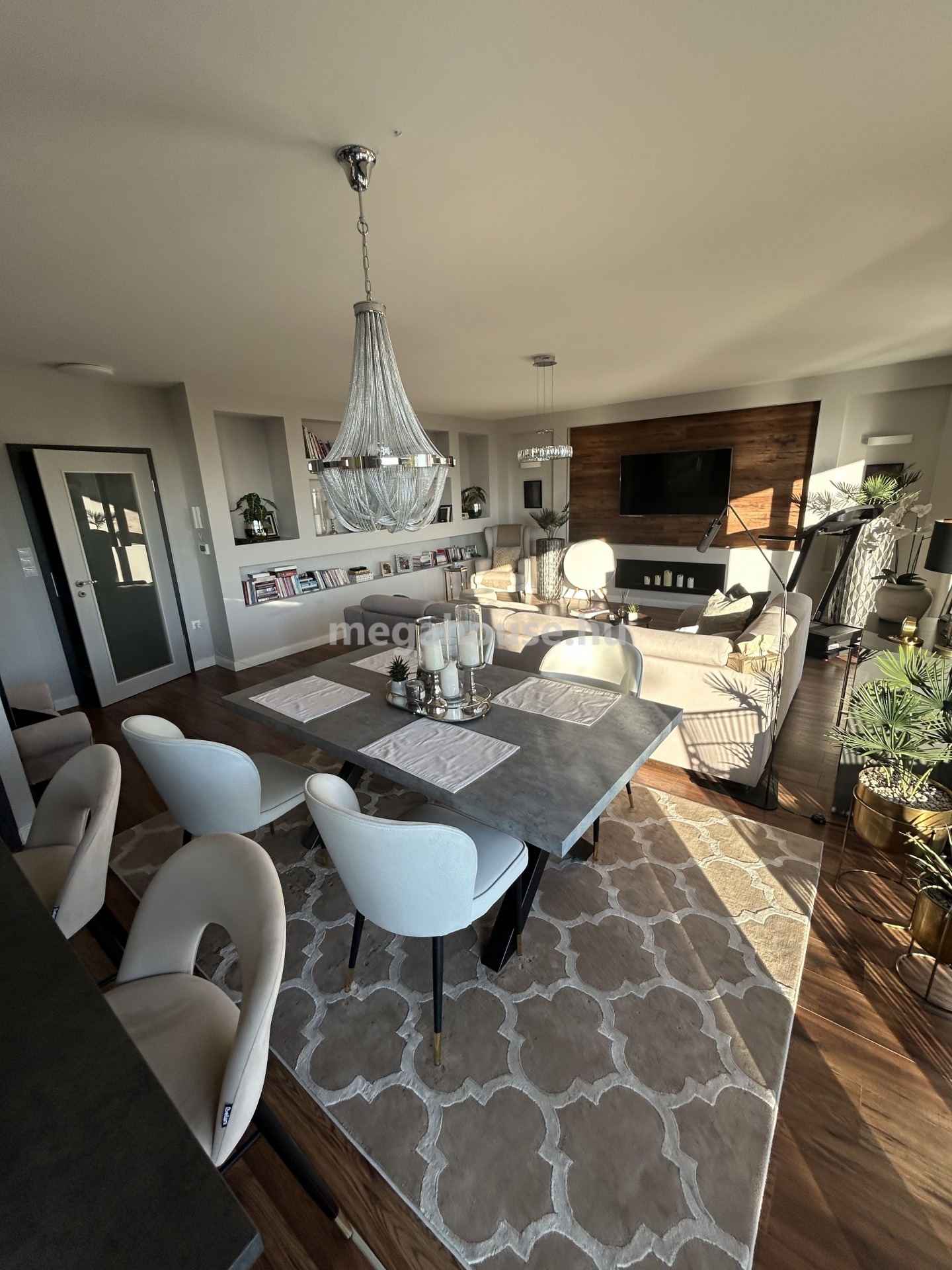 A két szintes épület földszintjének éke az amerikai konyhás/étkezős nappali, mely hatalmas nyílászáróinak köszönhetően napfényben úszik, emellett csodás panoráma tárul elénk. Konyhája teljeskörűen, Bosch gépekkel felszerelt.