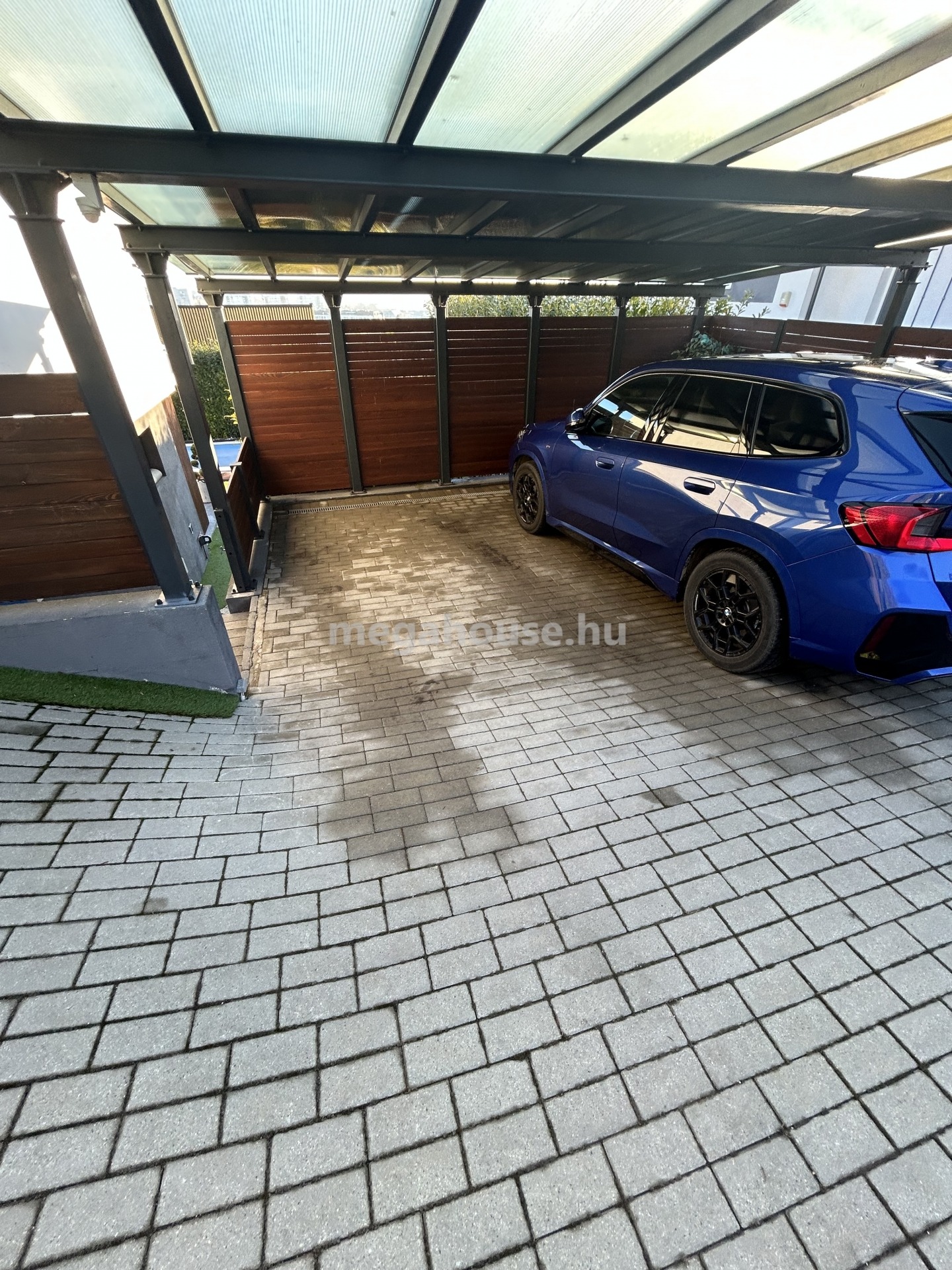 Két gépjármű részére fedett, elektromos kapun keresztül megközelíthető, elektromos töltőállomással is rendelkező beálló áll rendelkezésre.
