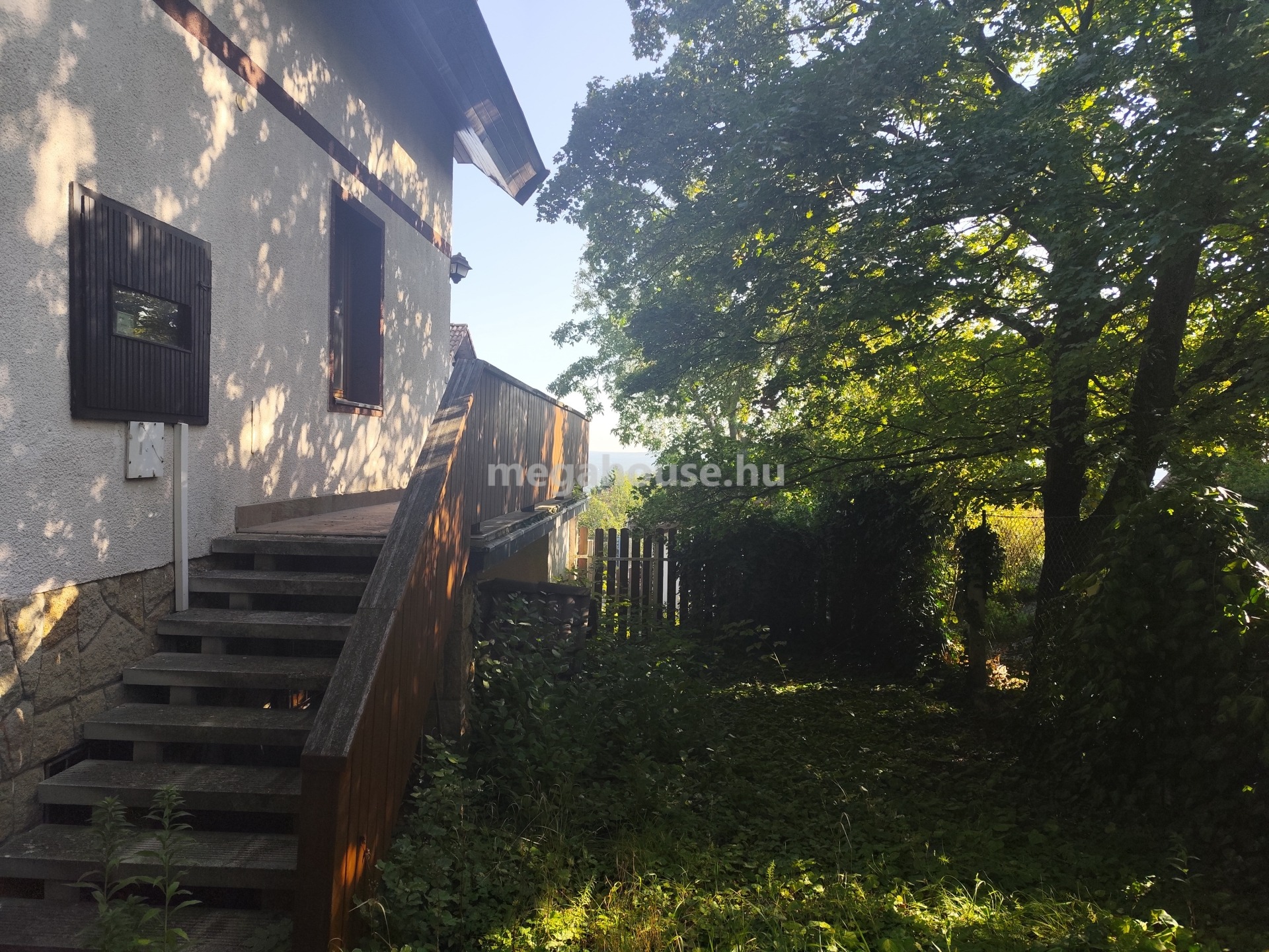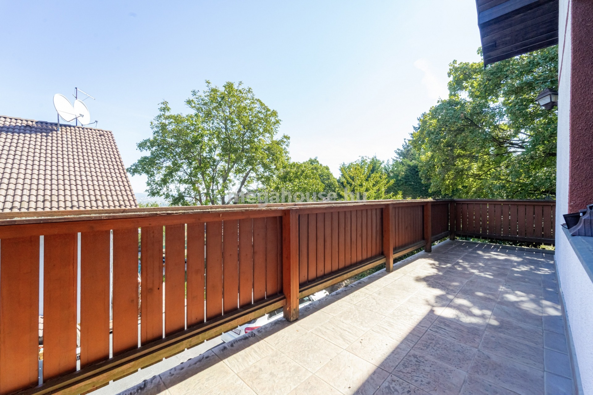 2 db terasz kapcsolódik a házhoz, az egyik a bejárat (konyha felől),a másik a nappali felől. Előbbi 18 nm, utóbbi 20 nm panorámás kilátással.