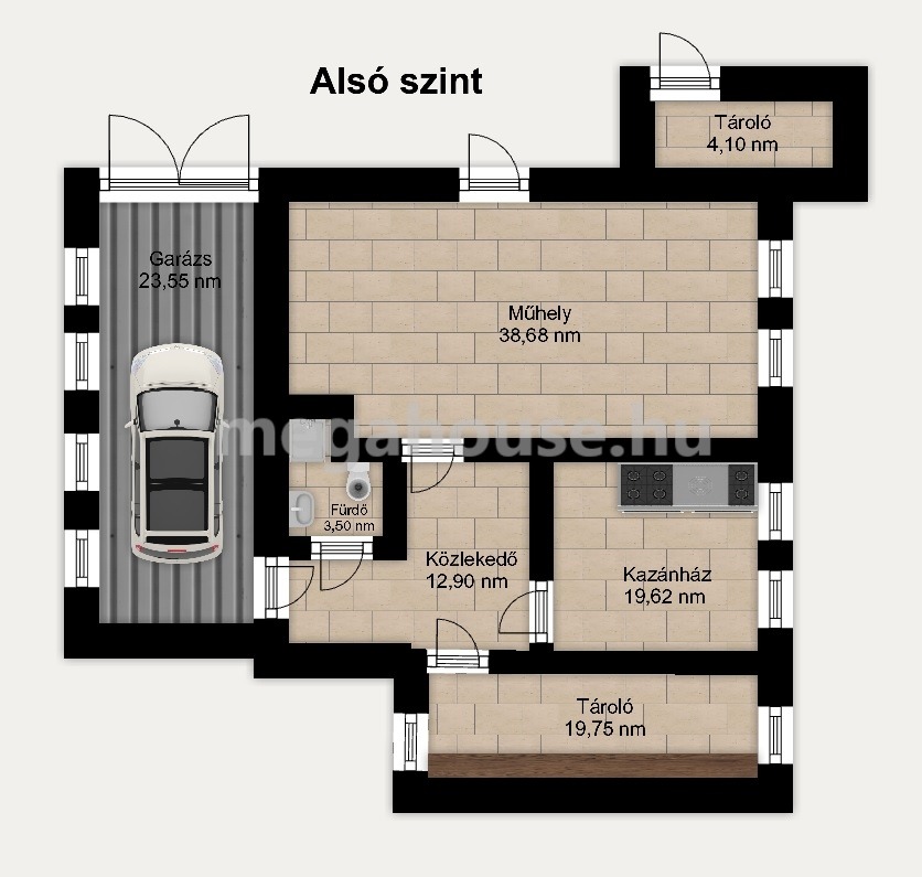 A földszinten található egy kényelmes garázs, kazánház, tároló, fürdőszoba, valamint egy 38 nm-es helyiség, amely tökéletes lehet vendég szobának, wellness/fitness funkciónak vagy műhelynek. Innen belső lépcsőn keresztül juthatunk fel az alaprajz szerinti emeletre, de ez az szint a kert felől is megközelíthető külön bejáratú földszintnek felel meg. Ezen a szinten lett kialakítva egy tágas ,nagy befogadó képességű ( 25 nm) konyha, nappali