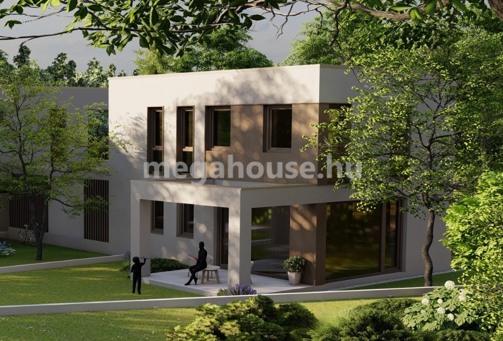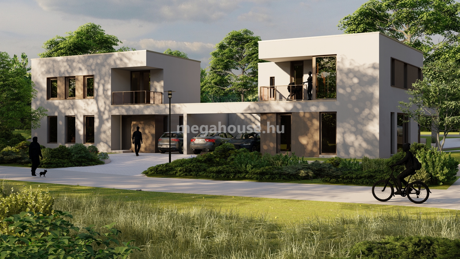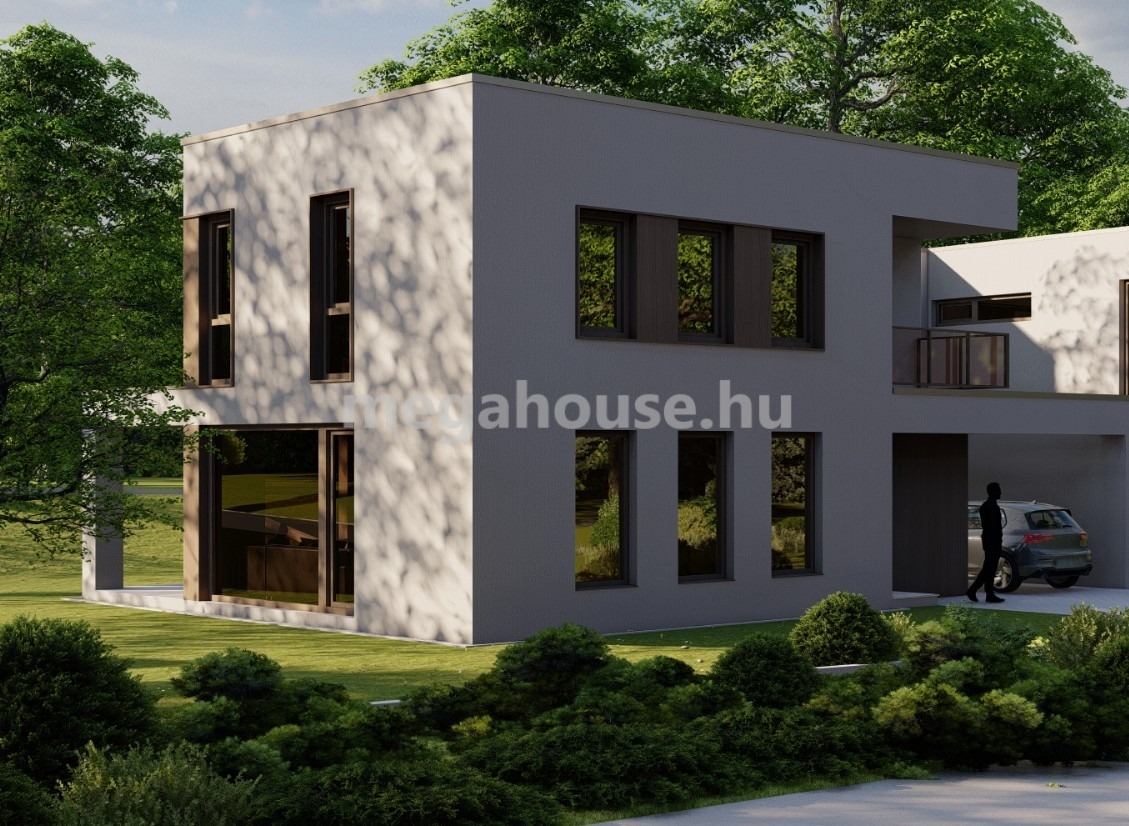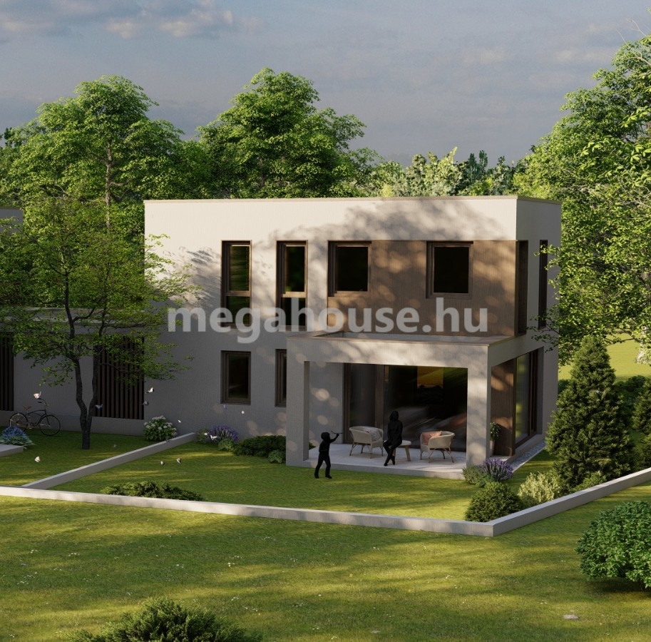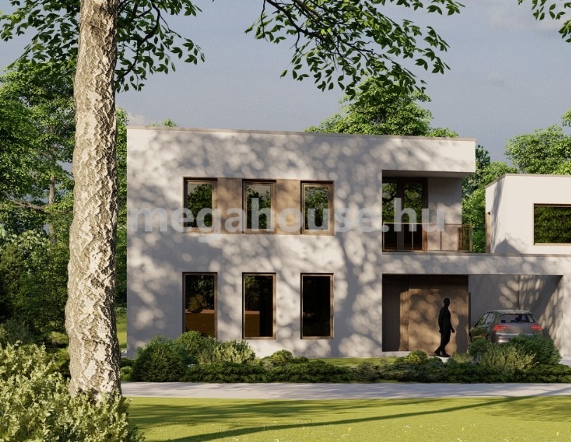 A nettó 110 nm-es épület önálló, csupán a tároló és a fedett parkoló köti össze a másik lakóegységgel.