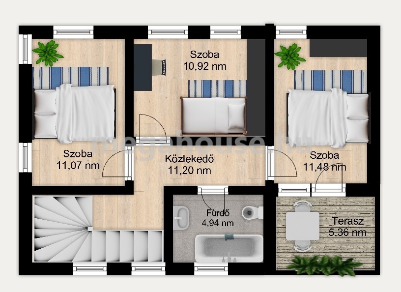 A felső szinten 3 hálószoba, fürdőszoba és a szülői hálóhoz kapcsolódó terasz található.