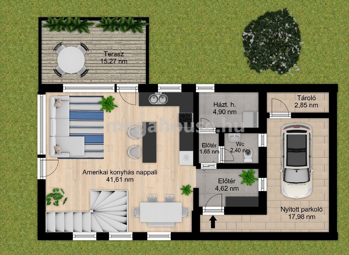 Csendes, NY-i tájolása van. A földszinten nagy amerikai konyhás nappali, háztartási helyiség, vendég mosdó található. Innen léphetünk ki a 15 nm-es teraszra és a 415 nm-es saját kertbe.