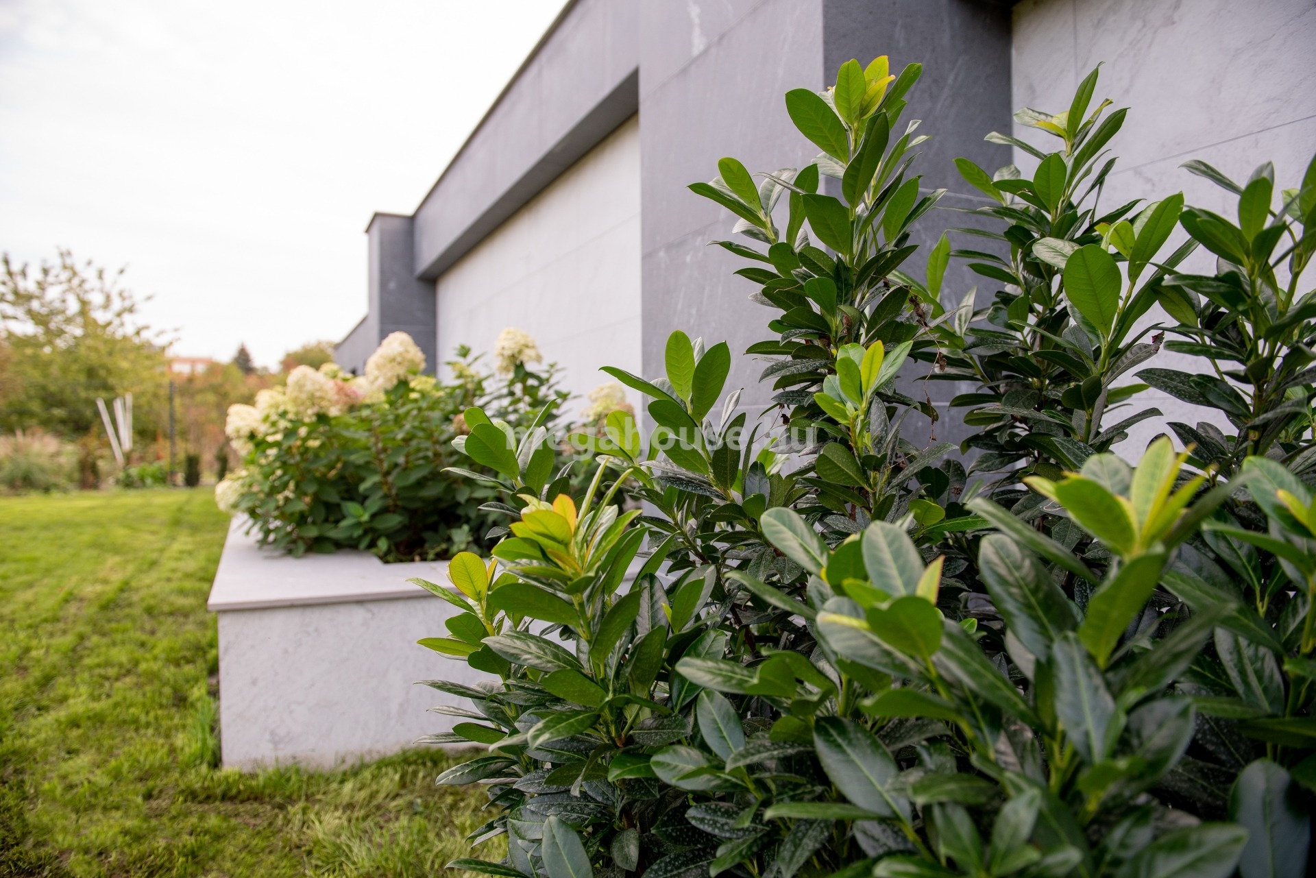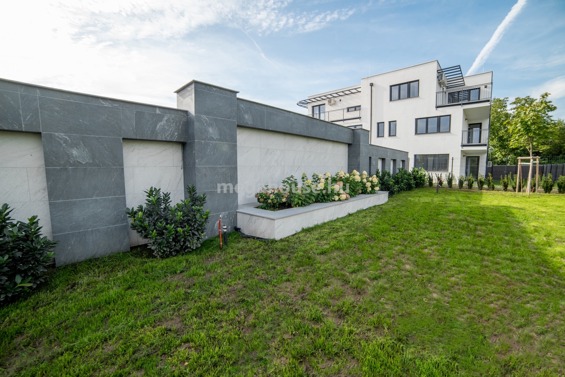 A szépen növényesített modern minimál stílusú közös kertben szabadtéri úszómedence és szauna biztosítja a lakók kényelmét.