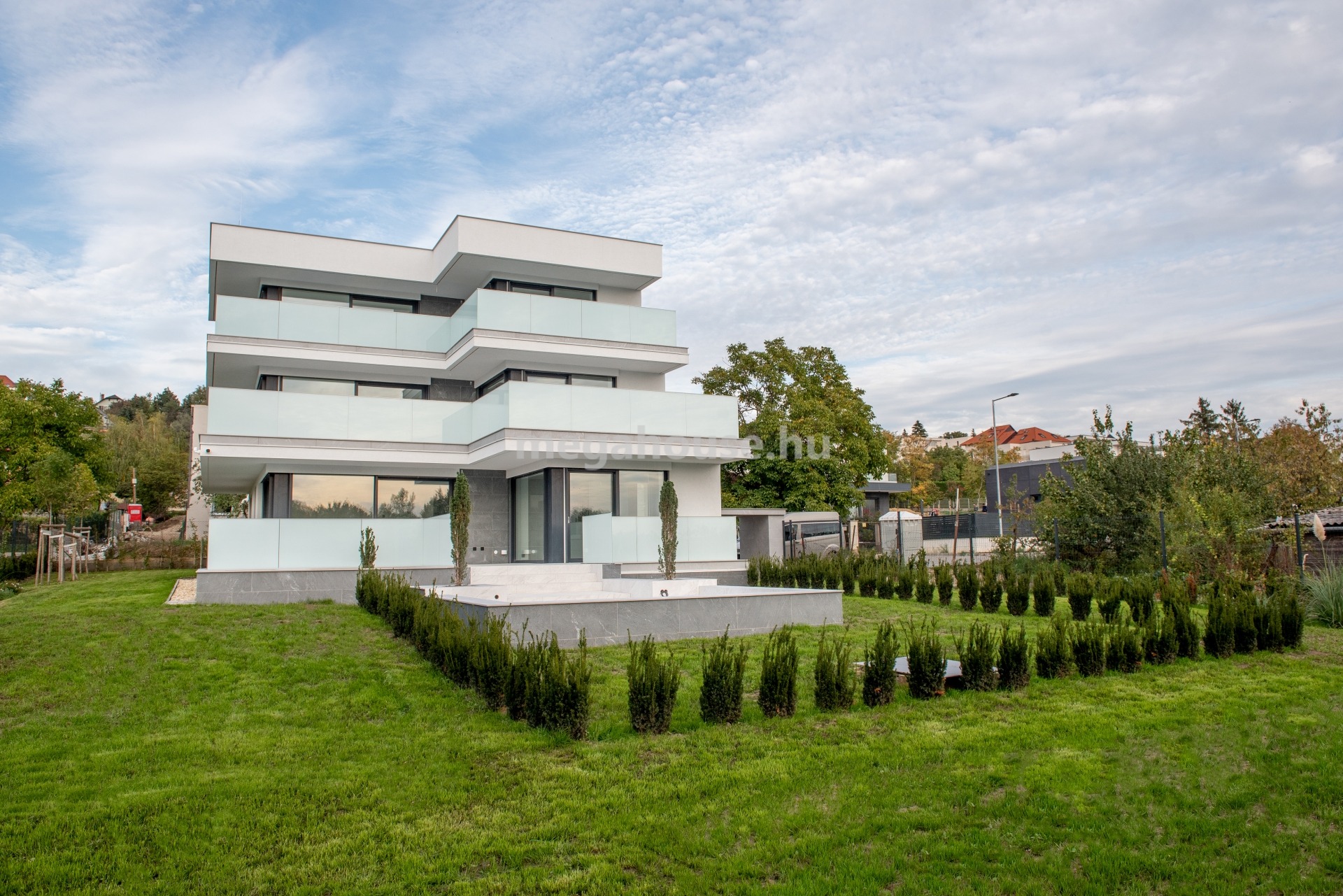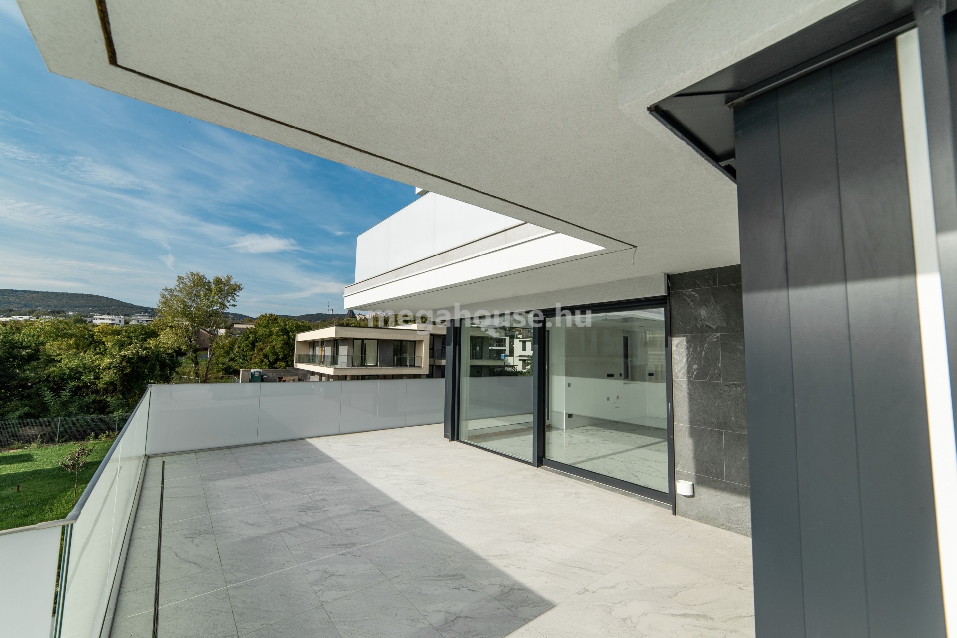 Madárhegy déli lejtőjén 3 lakásos LUXUS, teraszház jellegű társasházban földszinti 91 nm-es lakás hatalmas TERASSZAL és 100 nm KERTTEL 251 M Ft-ért eladó.