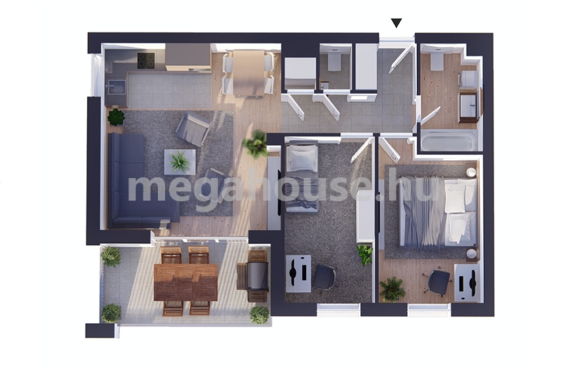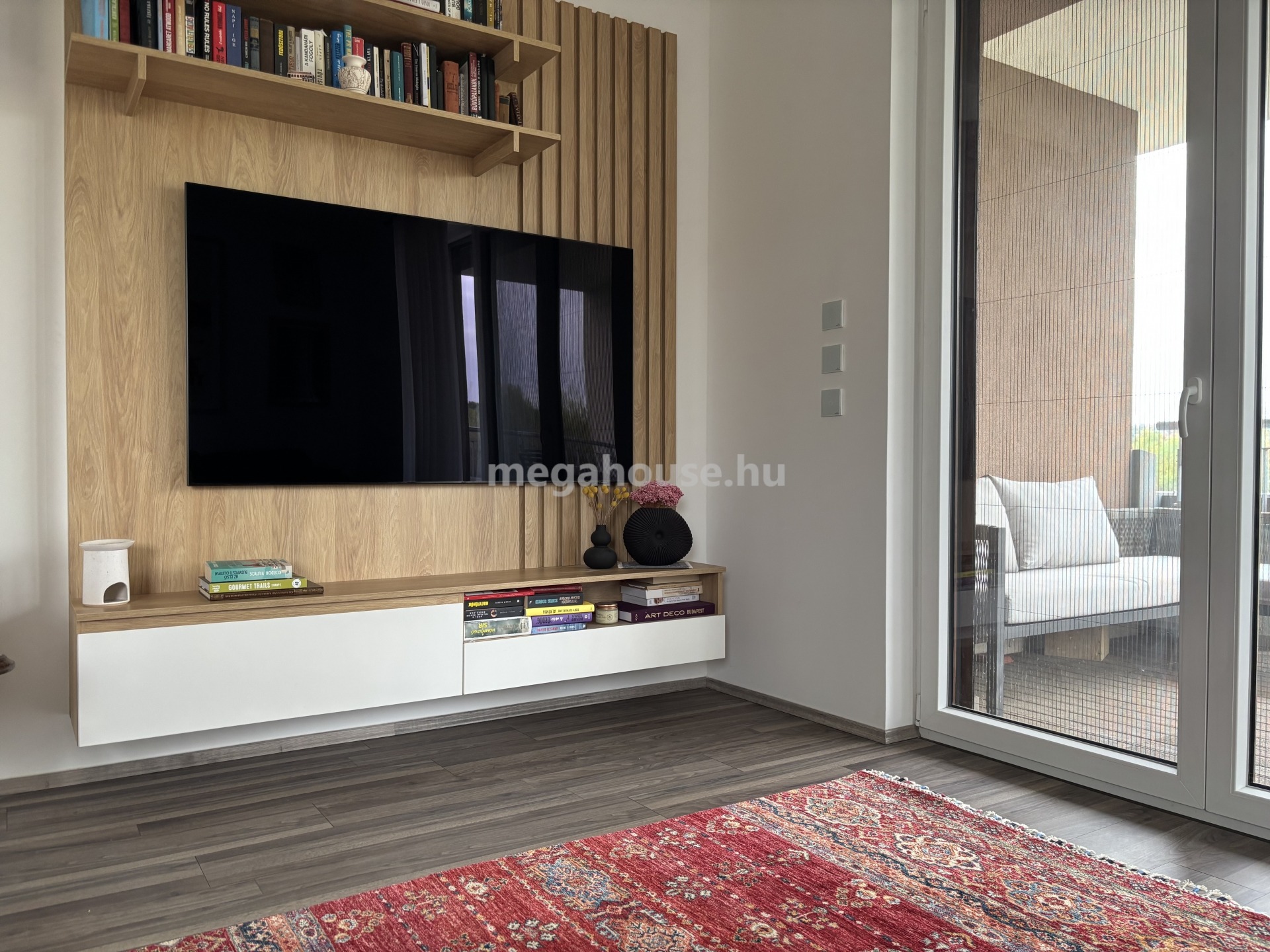 A lakás központja a tágas, amerikai konyhás nappali, melyet két különnyíló hálószoba, modern fürdőszoba, külön WC és praktikus háztartási helyiség egészít ki. A dél-nyugati tájolású, 10 m²-es, WPC burkolatú terasz a budai hegyekre néz. A konyha prémium minőségű, Electrolux beépített gépekkel felszerelt, a beépített bútorok (konyha, háló, előszoba, nappali) az ár részét képezik.