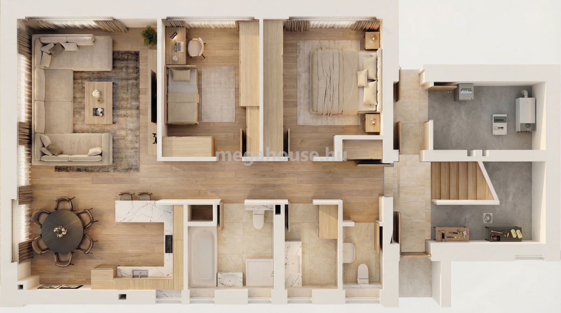 Az előtérből nyílik a két kényelmes méretű hálószoba, háztartási helyiség , fürdőszoba , és a hatalmas nyílászárókkal rendelkező, 35 nm-es amerikai konyhás nappali.