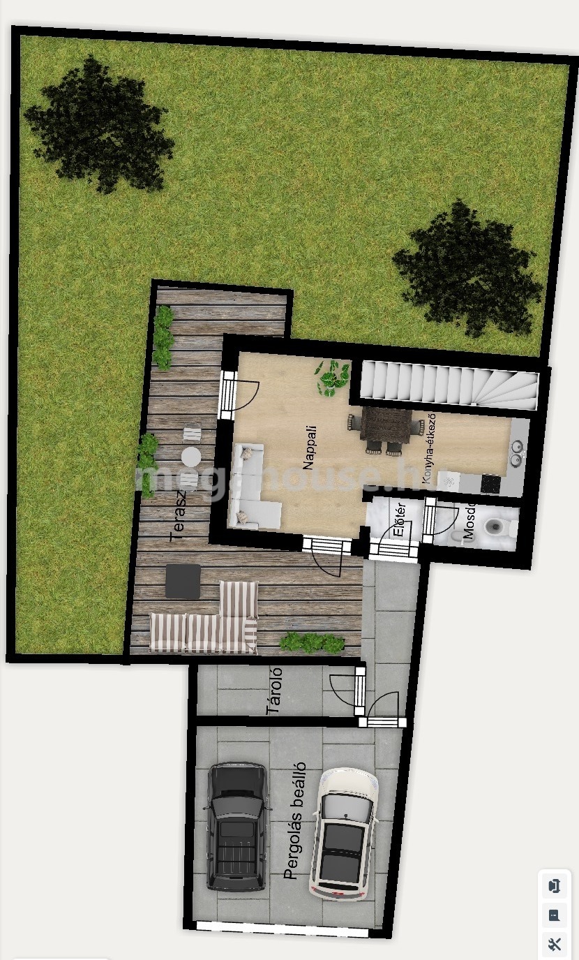 A FÖLDSZINTEN nagy amerikai konyhás nappali, (NY-i tájolás ), háztartási helyiség, vendég mosdó található. Innen léphetünk ki a 13 nm-es teraszra és a kertbe.Itt egy árnyékos pergolás második terasz is kialakítható a nappali és tároló közötti területen, közel a konyhához.