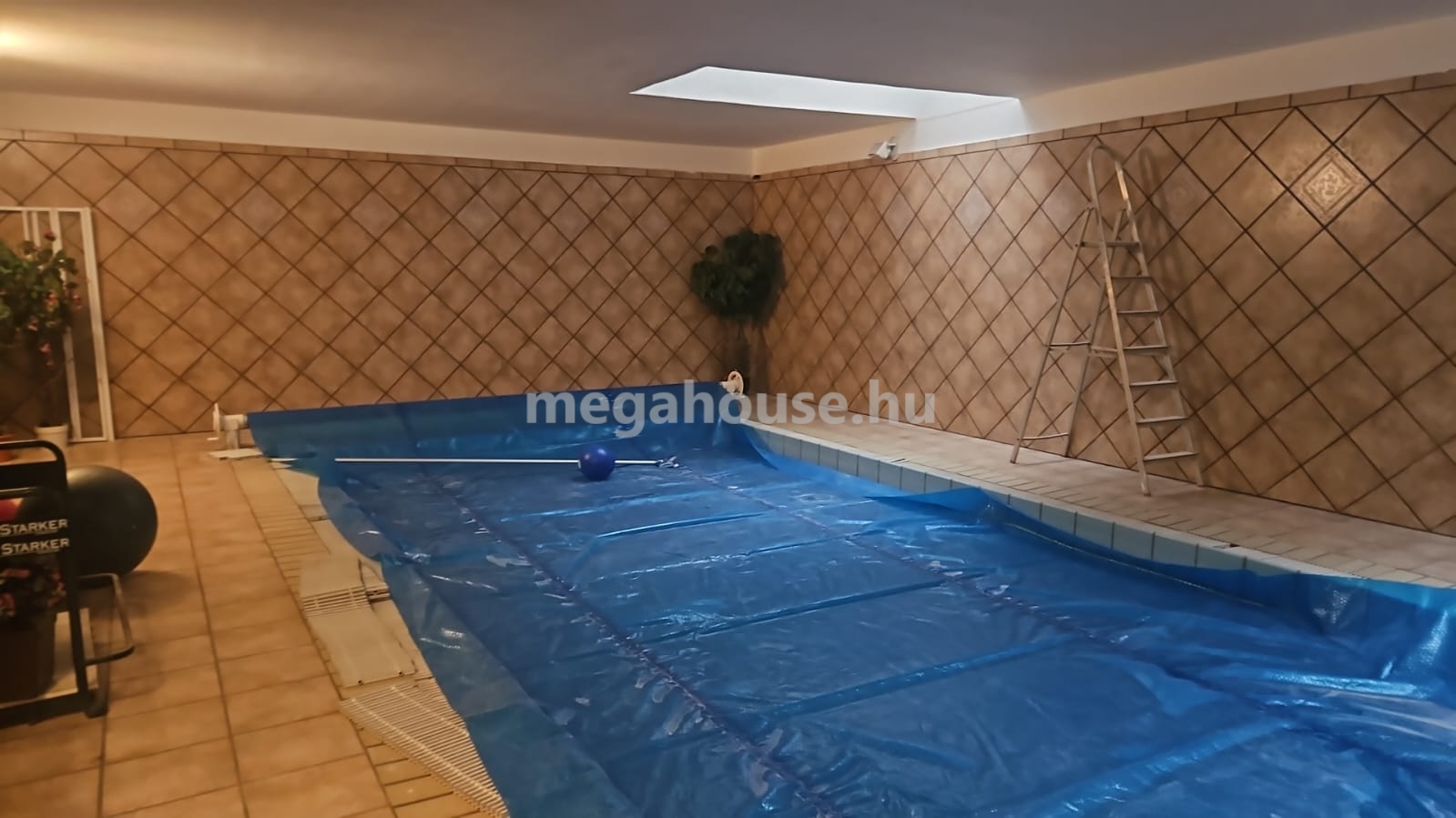 Wellness részleg: medence, szauna, egy társasági tér gépesített konyhával, nagy és különleges kandallóval, fürdő, wc