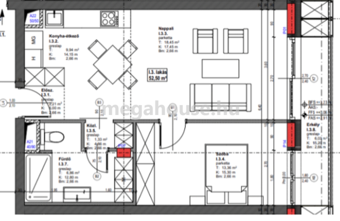 Kialakítás: Nettó 52 nm-es, N+1 szobás lakás 6 nm-es nyugati tájolású erkéllyel.