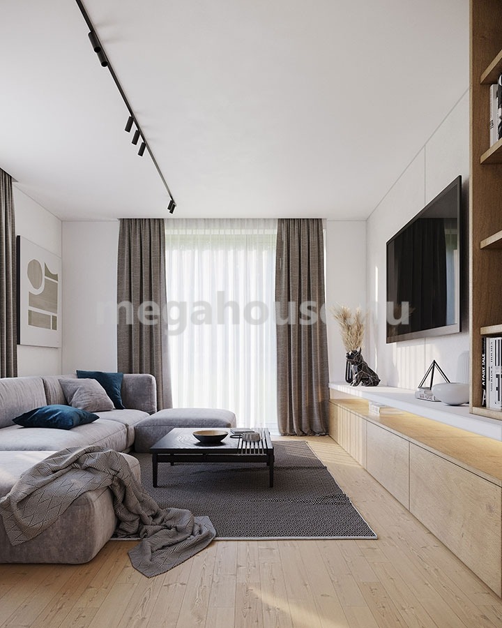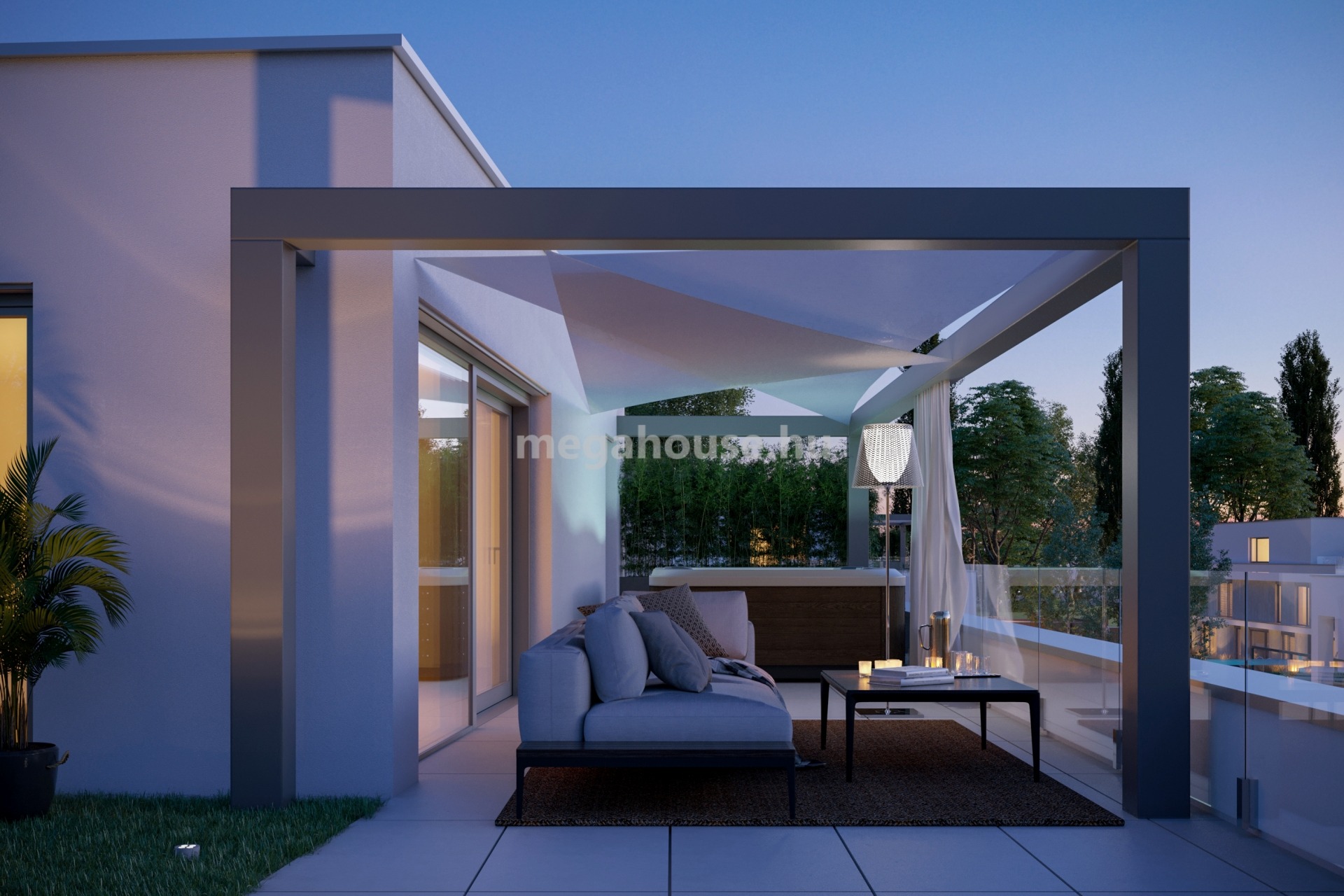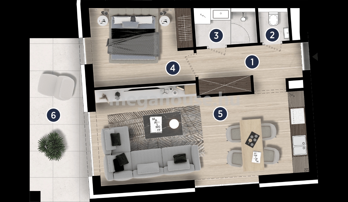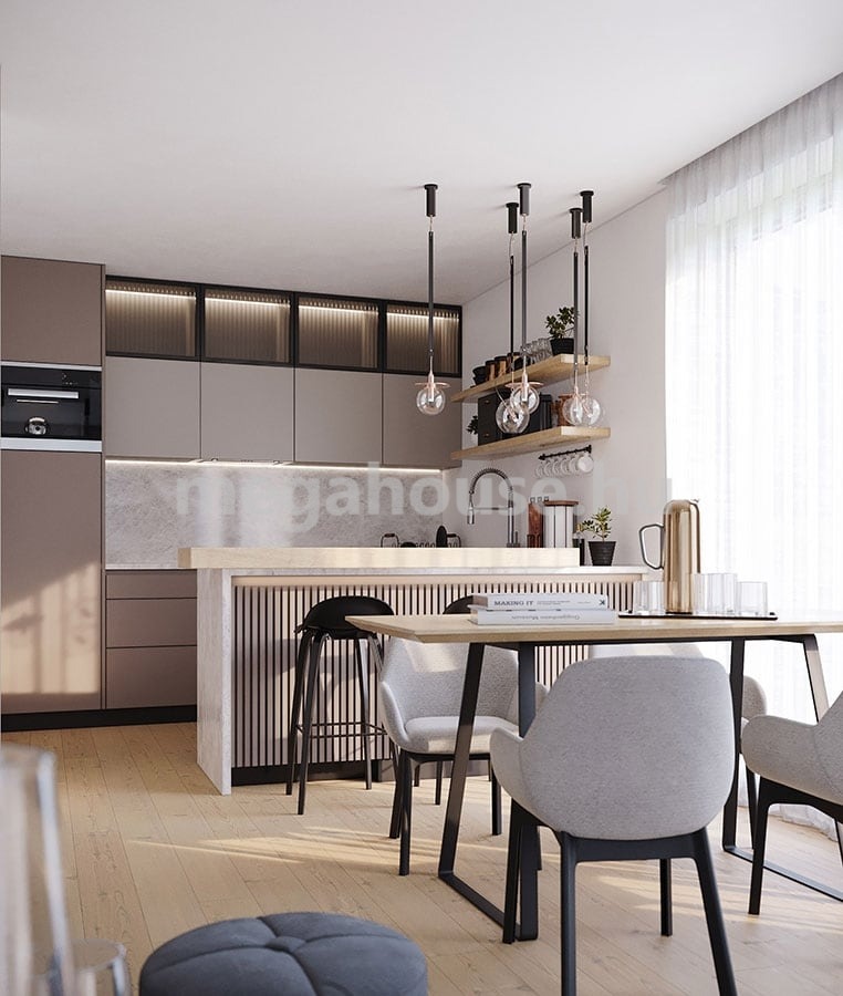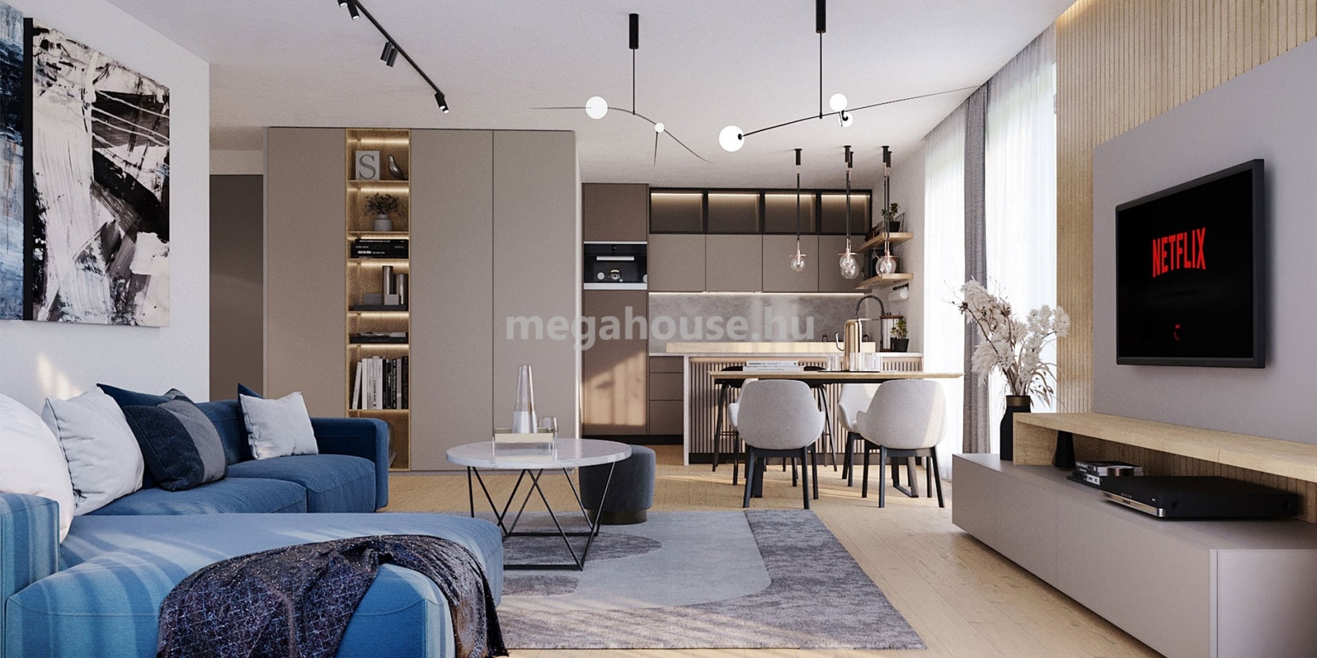 Az amerikai konyhás nappali a DNY-i oldalon található, innen nyílik a 6 nm-es terasz. Egy különnyíló hálószoba biztosítja a nyugodt pihenést. Az ingatlant saját használatú kertrész veszi körül.
