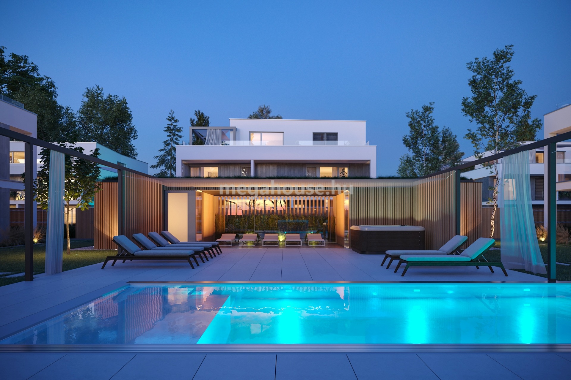 A projekten belül nagy füves területek és egy központ szabadtéri medence is található.
