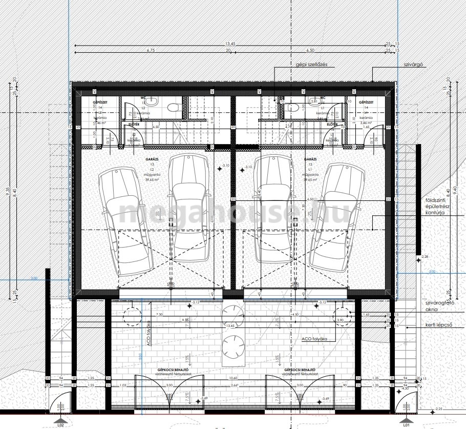 Garázsszint (-1): 47,02 m² – saját, 2 állásos garázs