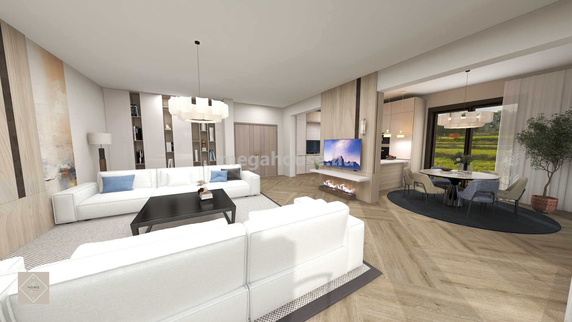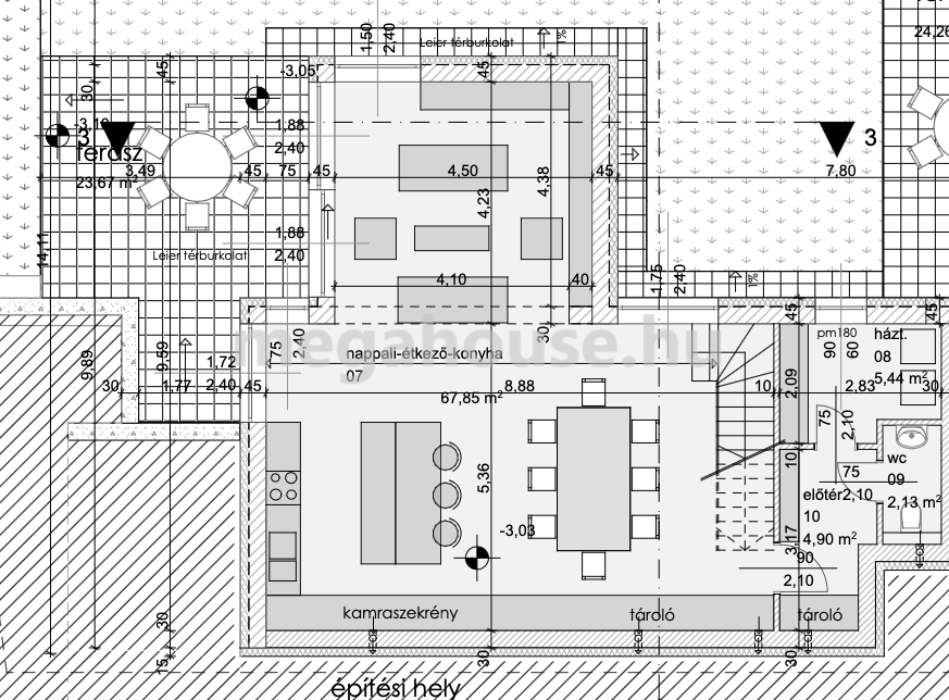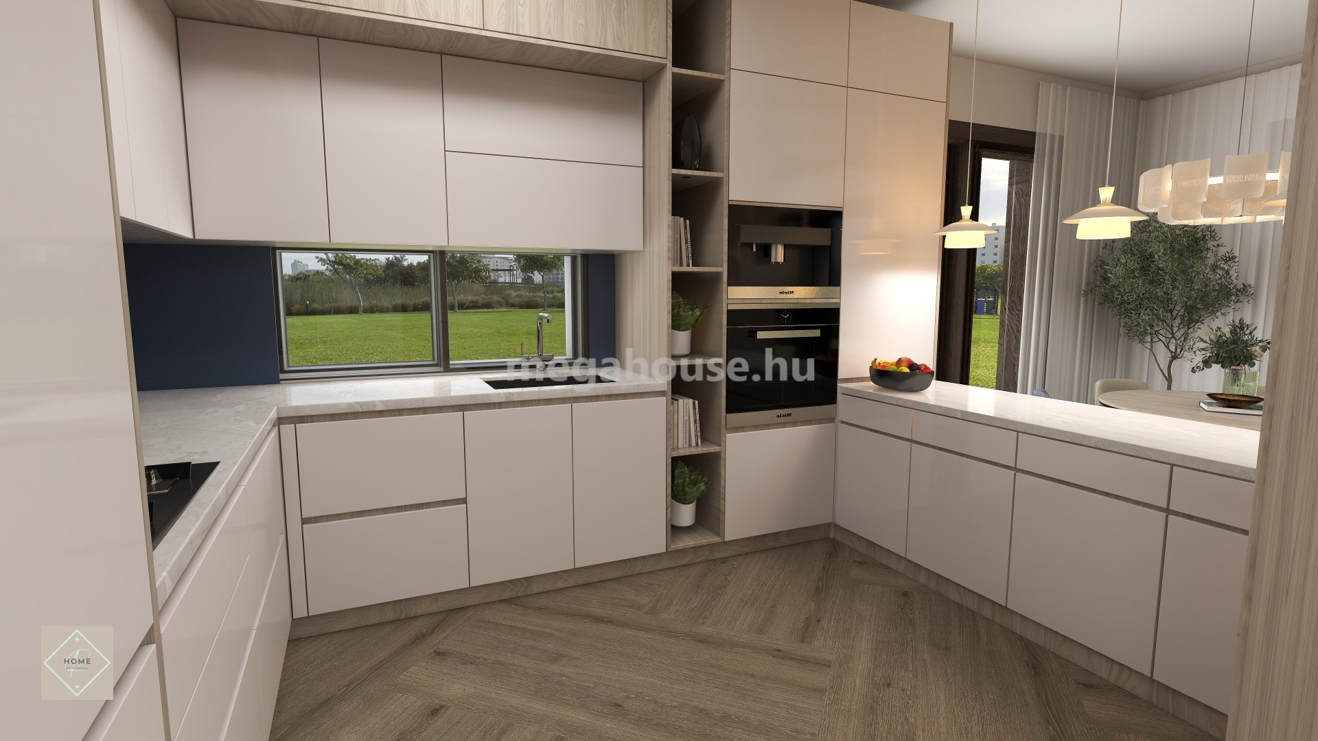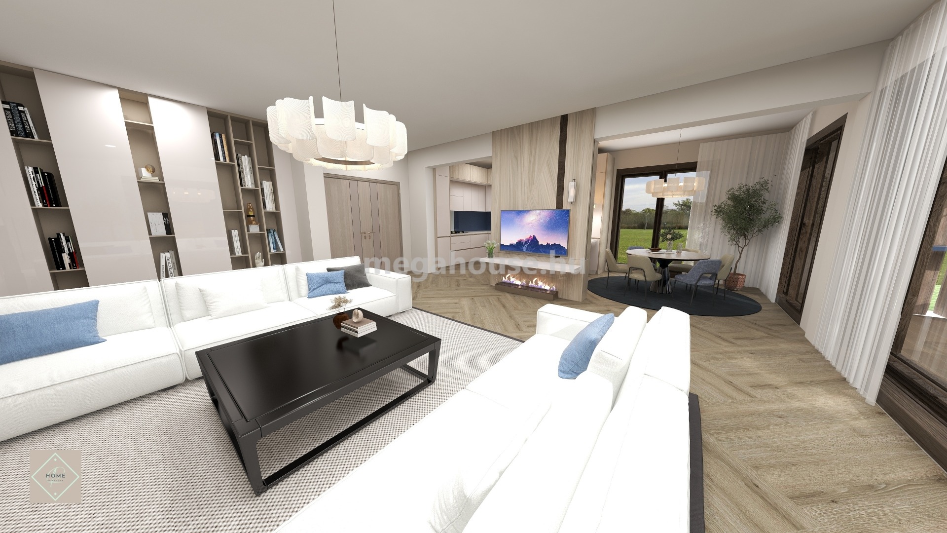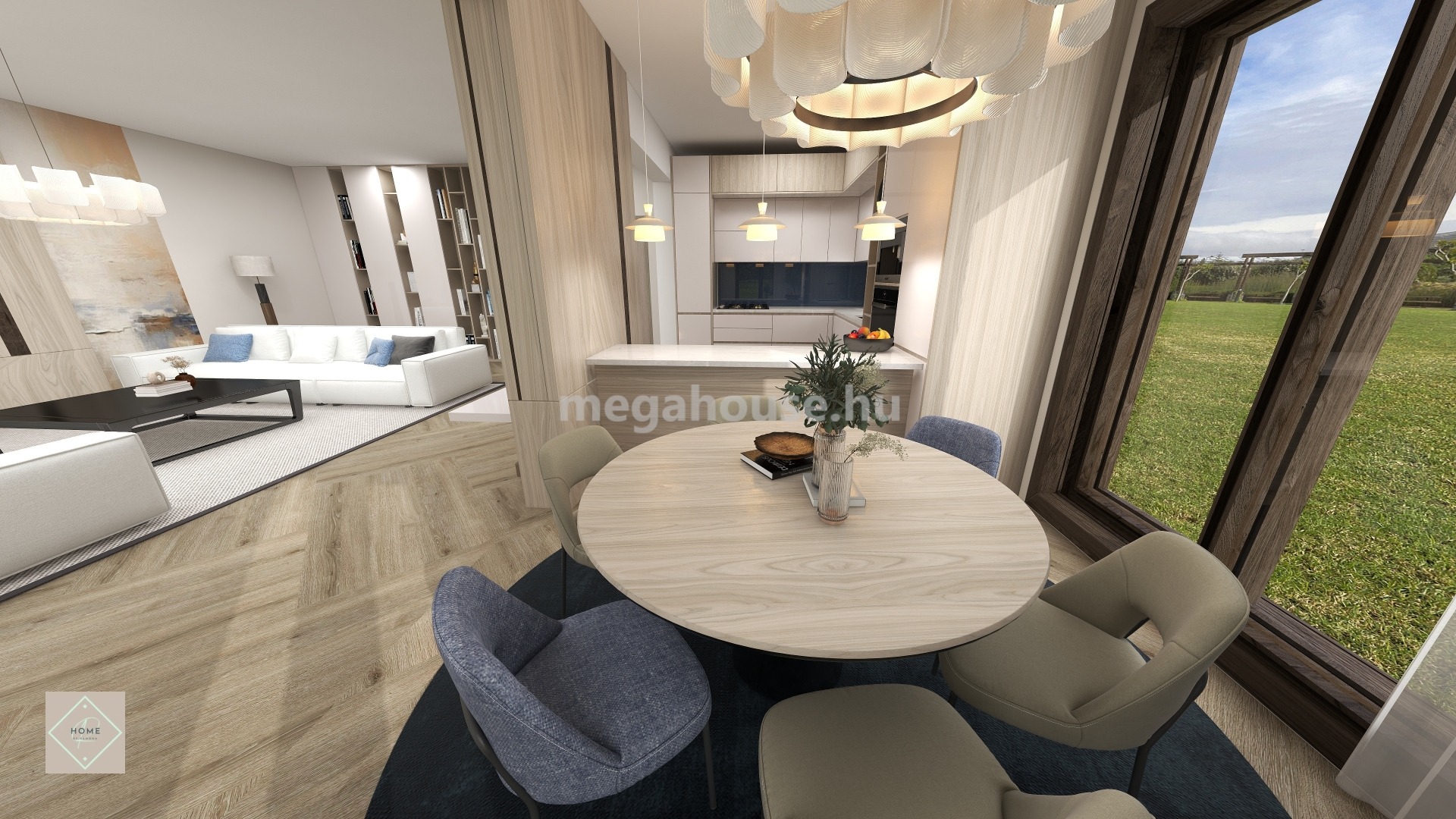 A ház előterétől balra található a rendkívül világos, kényelmes terekkel rendelkező, amerikai konyhás/étkezős nappali, melyhez kapcsolódik egy 24 nm-es terasz, azon túl pedig a sík kertrész.